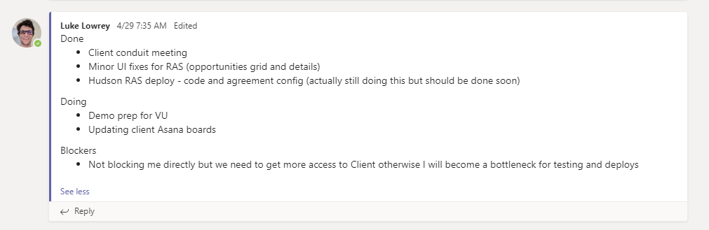 This type of short, recurring daily update lends itself well to collaboration tools like Slack and Microsoft Teams. Endpoint IQ uses a dedicated Teams channel #standups to post the updates. Any questions or updates from the team takes place in the replies to the original post. This keeps the discussions easy to follow over the course of the week. I also encourage people to posts screenshots, videos or gifs of their work.