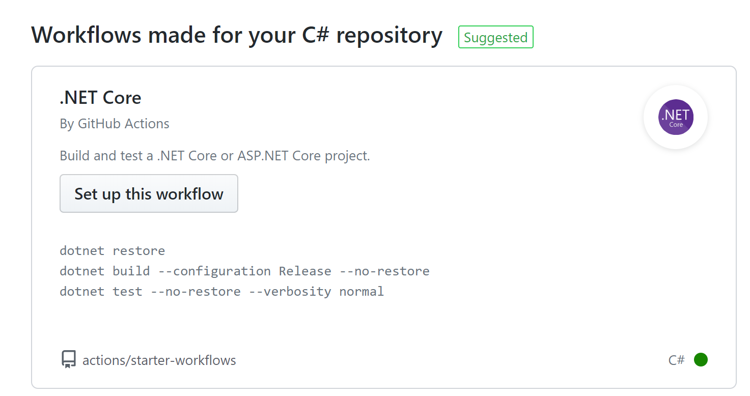 Creating a new workflow creates a yaml file in .github/workflows for the repository. Infrastructure as code! The best way to start is create a new workflow using the .NET Core starter action.