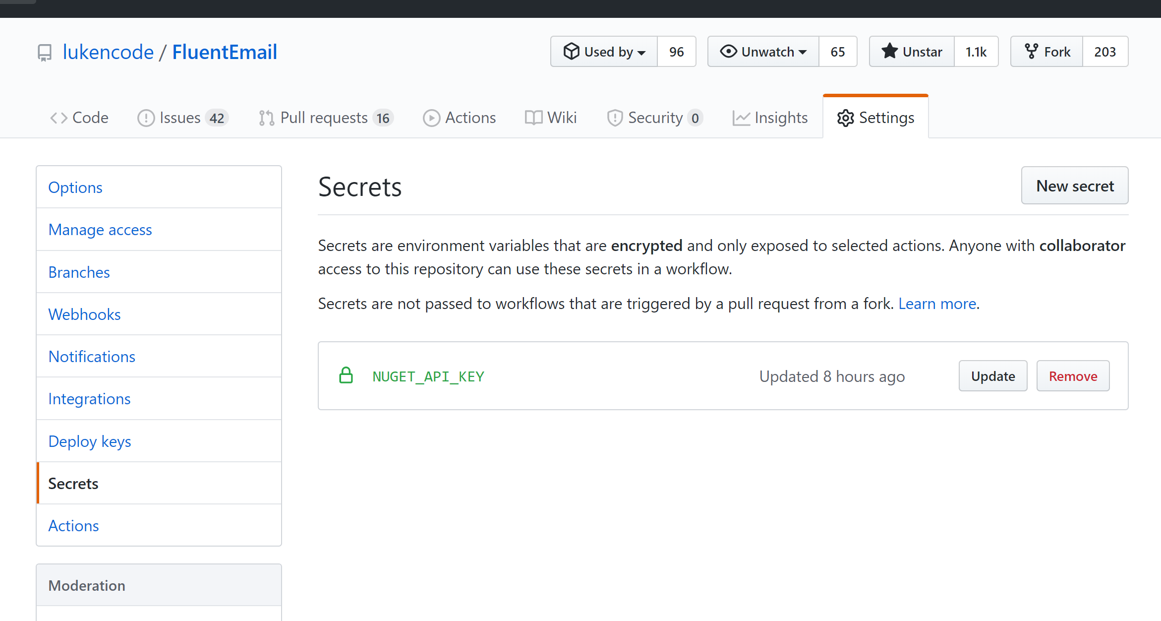 You can then enter the key as a secret in your GitHub repository. The key for the secret must be NUGET_API_KEY. The API key will then be available to the publish package action workflow.