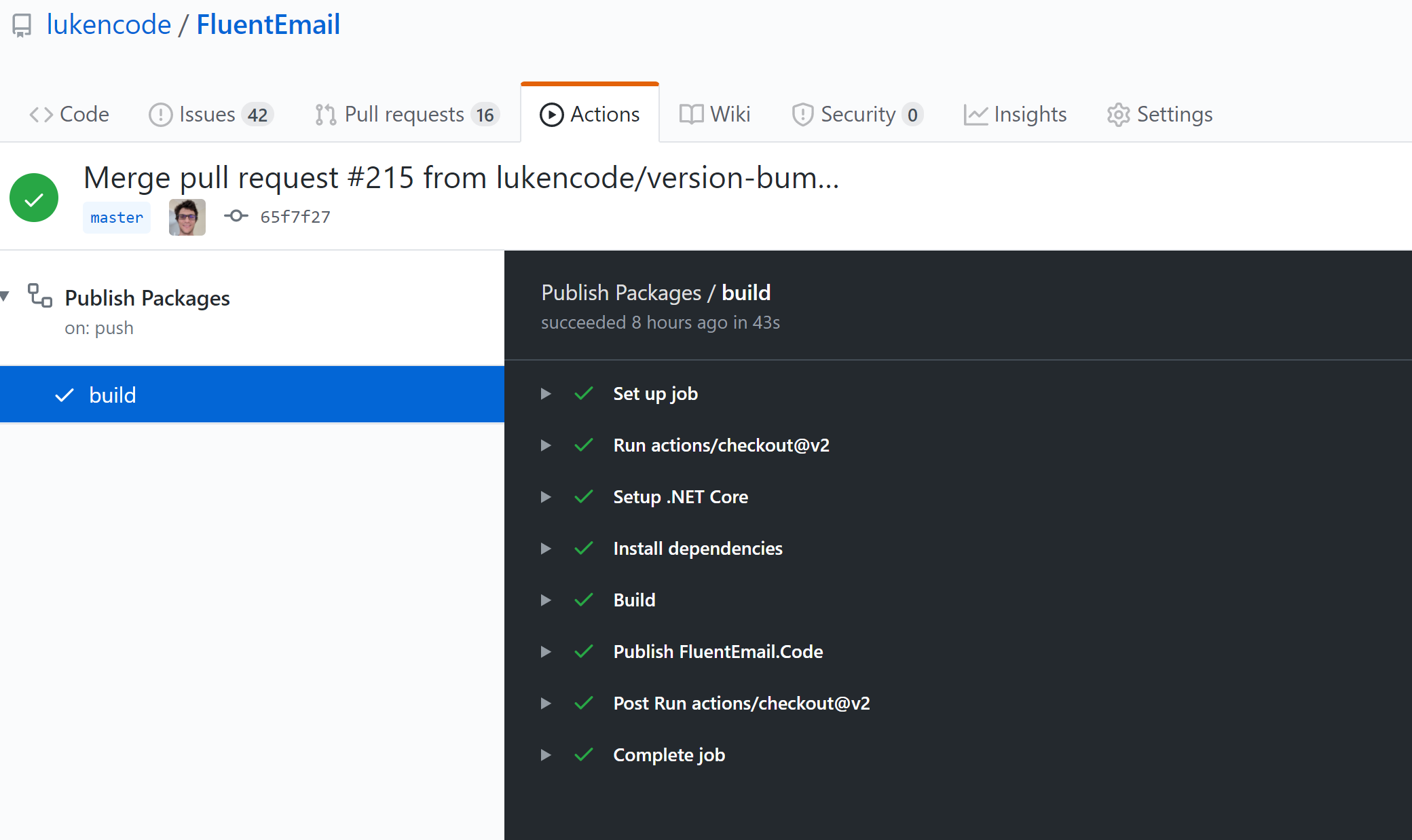 Now when code is push to the master branch (and the project version changes) the publish packages action run and publishes the nuget package!